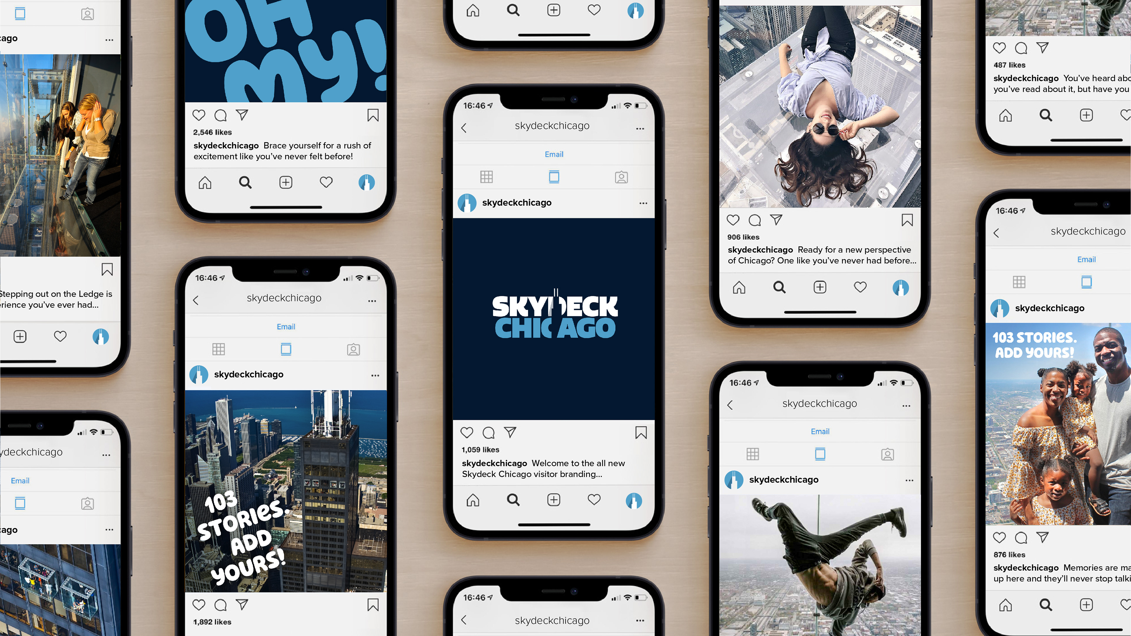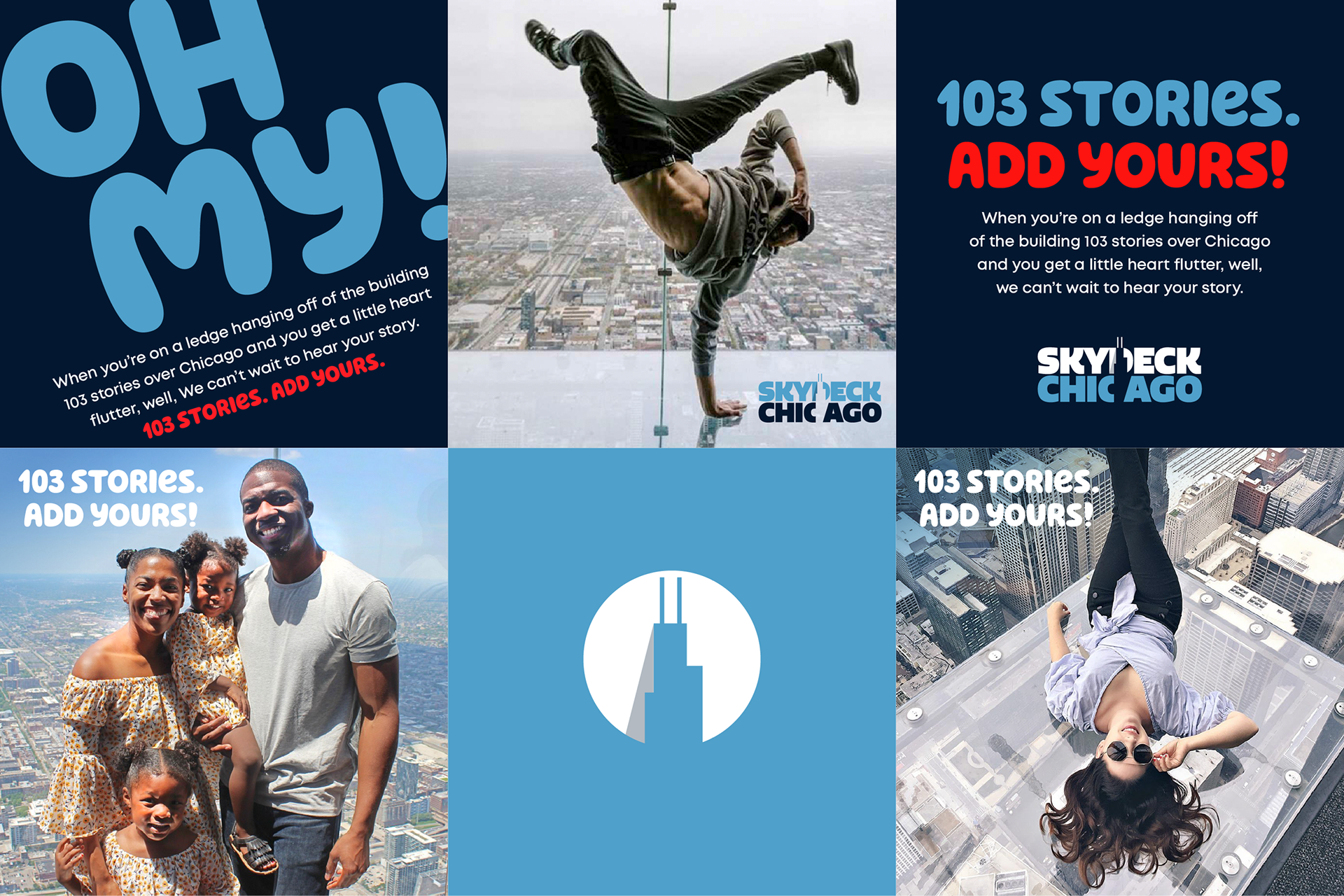 Perched 103 stories over the Chicago sits one of the city’s top tourist attractions, the Skydeck at Willis Tower. From this iconic vantage point, you’ll be treated to sweeping views of Lake Michigan and four surrounding states through the floor-to-ceiling windows. The work displayed below is all concept work for a rebrand that was paused during the pandemic.
