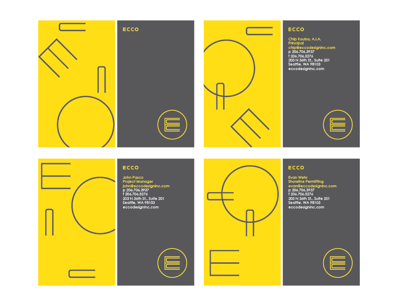 The previous identity was built around a logotype that was typeset in all lowercase green letters. Not only did the look of the mark misrepresent their work (only partially "green" design), but it also meant that people often misread their name. It turns out it's pronounced "echo"—and the name came from the Italian term that refers to the "aha" moment. My efforts focused on representing that concept—using an energetic, yet sophisticated, yellow/gray combination to bring the new "aha" concept to life. Look carefully and see if you can solve the riddle.